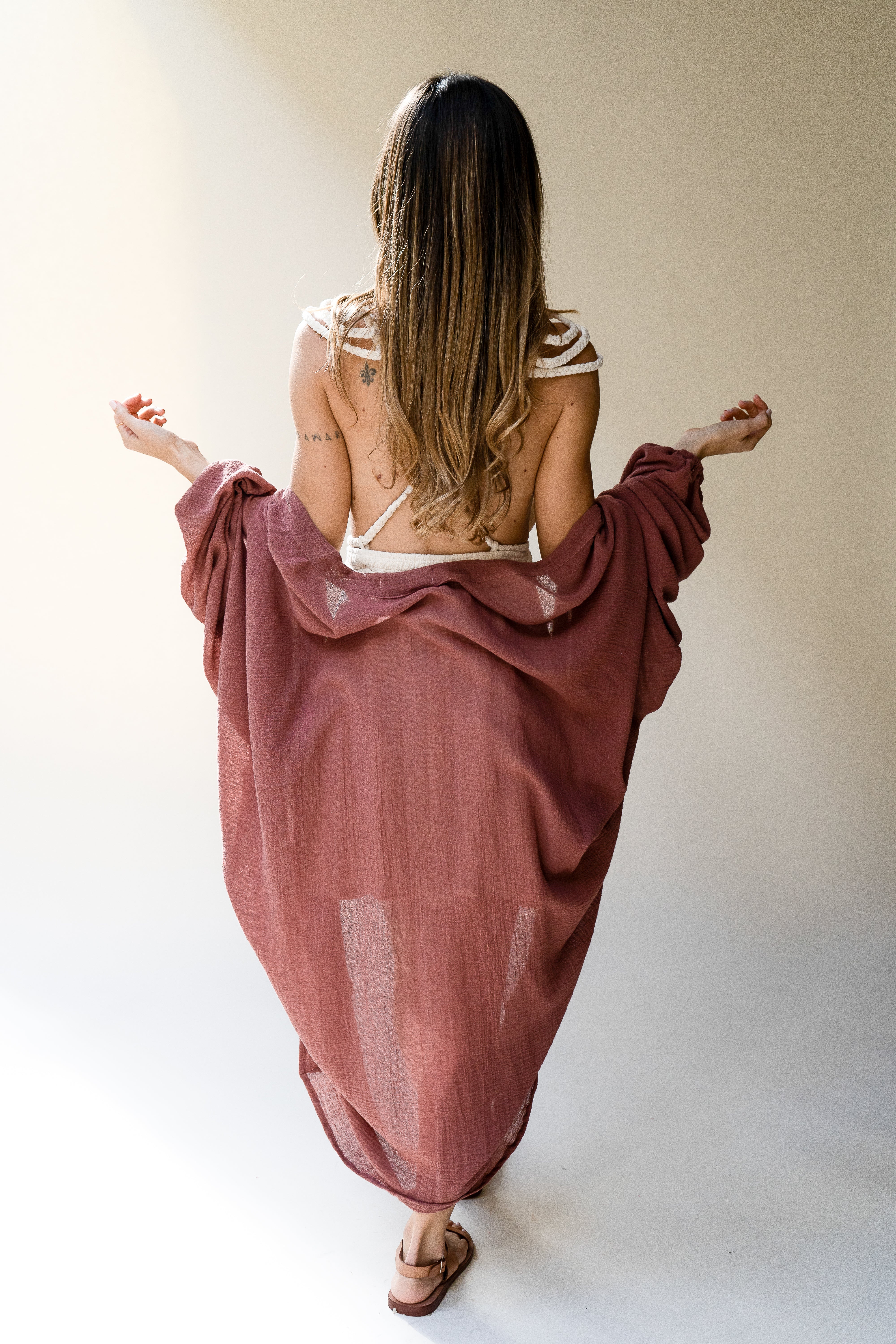 The Isabelle is an effortless robe-style cover-up designed for the in-between moments — post-shower, after a swim, on the way to breakfast, or layered over your favorite base pieces. Cut with an open front and relaxed drape, it brings softness, ease, and quiet elegance to everyday rituals at home or away.