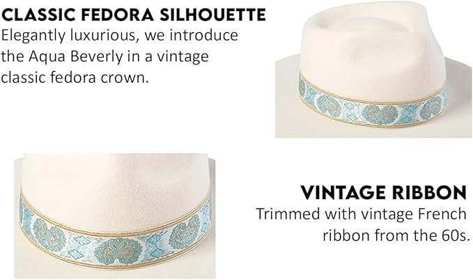 Style matters, and that's made clear by the Aqua Beverly Wool Fedora Hat. This stunning unisex fedora features a 1960s vintage ribbon hat band with shimmering aqua embroidery. This Australian design uses true, authentic Australian wool that makes for one high-quality hat you'll love to wear for years.